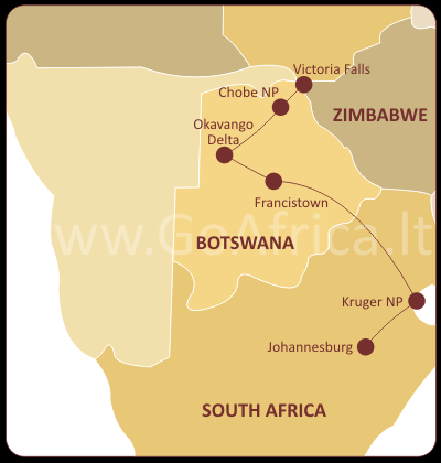 Vienuolikos dienų kelionė prasideda prie didingo Viktorijos krioklio Zimbabvėje ir nusitęsia į Botsvaną, kur aplankysime Čiobės nacionalinį parką . Parke gyvena milžiniškos dramblių kaimenės, o pamatyti juos geriančius galėsite ramiai plaukdami valtele Čobės upe. Po to kelias naktis stovyklausime po atviru dangumi Okavango deltoje - viename iš ramiausių Afrikos dykumų regionų. Galiausiai aplankysime didžiausią Pietų Afrikos Respublikos nacionalinį parką , kuriame gyvena „didysis Afrikos penketas" ir daugelis kitų laukinių gyvūnų ir paukščių rūšių, o nuotykius užbaigsime šurmuliu kunkuliuojančiame Johanesburge.